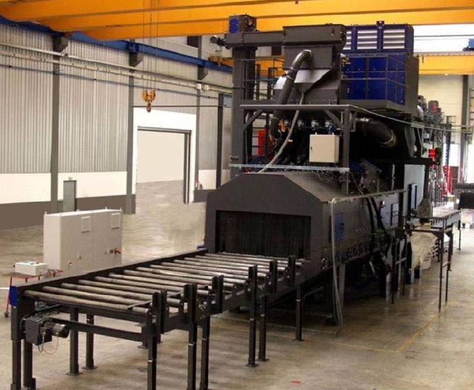 爬架拋丸機(jī)一般采用通過式拋丸清理,輥道輸送將爬架往拋丸清理室內(nèi)輸送一邊拋丸一邊往拋丸清理室外輸送,整個工作過程無死角。爬架拋丸機(jī)的工作原理如下: