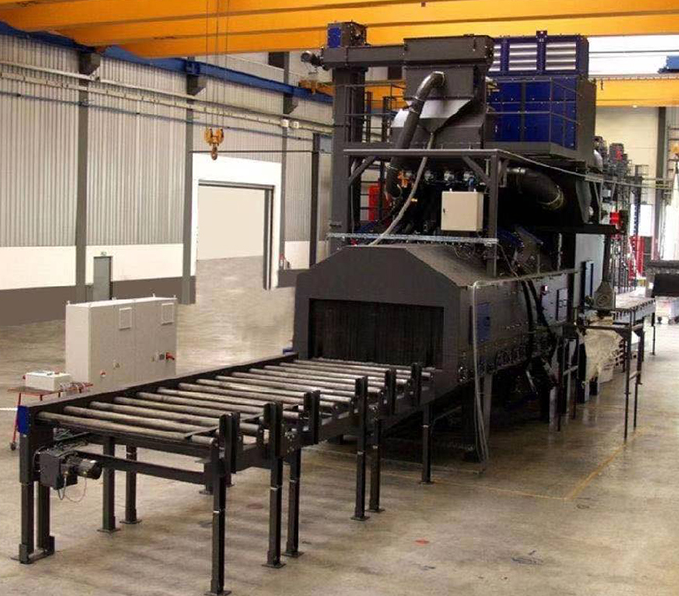 2、拋丸器布置形式為多角度,選用了大拋丸量、大功率雙園盤高效拋丸器,拋丸器的布置經(jīng)過計(jì)算機(jī)三維動態(tài)模擬,處理工件的所有截面都能得到彈丸的直射。