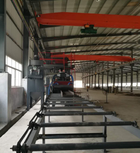 輥道通過式拋丸機(jī)在清理過程中由電氣控制的可調(diào)速輸送輥道將鋼結(jié)構(gòu)件或鋼材送進(jìn)清理機(jī)室體內(nèi)拋射通過式拋丸機(jī)區(qū),通過式拋丸機(jī)其周身各面受到來自不同坐標(biāo)方位的強(qiáng)力密集彈丸打擊與磨擦,使之其上的氧化皮、銹層及其污物迅速脫落,鋼材表面就獲得一定粗糙度的光潔表面,在清理室外兩邊進(jìn)出口輥道裝卸工件。