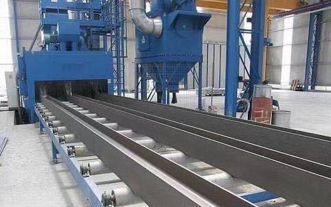 型鋼拋丸機用于大型工字型鋼、H型鋼尺寸較高的鋼結構件消除應力及表面除銹清理。輥道通過式拋丸機,清理過程中由電氣控制的可調速輸送輥道將鋼結構件或鋼材送進清理機室體內(nèi)拋射區(qū),其周身各面受到來自不同坐標方位的強力密集彈丸打 擊與磨擦,使之其上的氧化皮、銹層及其污物迅速脫落,鋼材表面就獲得一定粗糙度的光潔表面,在清理室外兩邊進出口輥道裝卸工件。