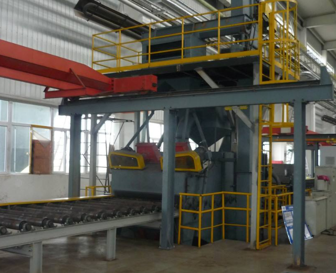 鋼托盤(pán)拋丸機(jī)主要是由清理室、室內(nèi)輸送輥道與進(jìn)出輸送輥道、拋丸器、彈丸循環(huán)系統(tǒng) ( 含提升機(jī)、分離器、縱橫螺旋輸送器和供丸管道 ) 、吹掃機(jī)構(gòu)、除塵、電氣控制等功能部件組成) 。