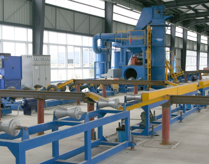 例如單根鋼管直徑1000mm,長度12000mm拋丸質量達到Sa2.5級以上清理速度每分鐘達到6米以上。需要配備4臺拋丸器,功率為15KW,就可以達到要求,反之鋼管直徑小于1000mm的同時在保證拋丸質量的前提下,速度可達到每分鐘6米以上。若大于鋼管直徑1000mm以上的,在保證拋丸質量的前提下速度會每分鐘小于6米。