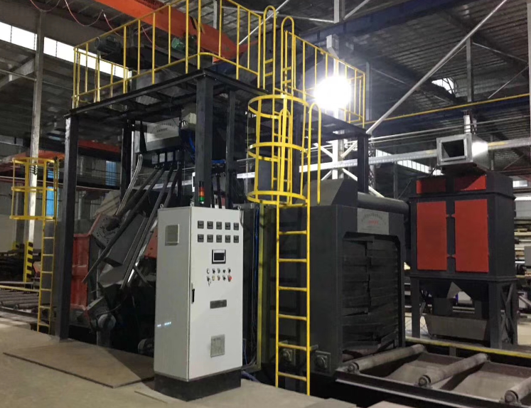鋼板通過式拋丸機(jī)主要有輸送輥道、前后密封室、拋丸室、拋丸器總成、彈丸循環(huán)系統(tǒng)、彈丸清掃系統(tǒng)、除塵系統(tǒng)以及電控系統(tǒng)等組成。