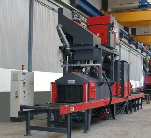 要達到上述目的,在所有表面處理方法中,磨料作為清理介質的清理方法最有效。以磨料為清理介質的清理方法有兩種,一種是用壓縮空氣(或高壓水)使磨料顆粒加速到很高的速度后清理工件表面的方法,即噴丸清理方法,常見的有各類噴砂機。另一種是以高速旋轉的葉輪推動磨料顆粒,使其獲得相當高的速度后沖擊工件表面,達到清理的目的。